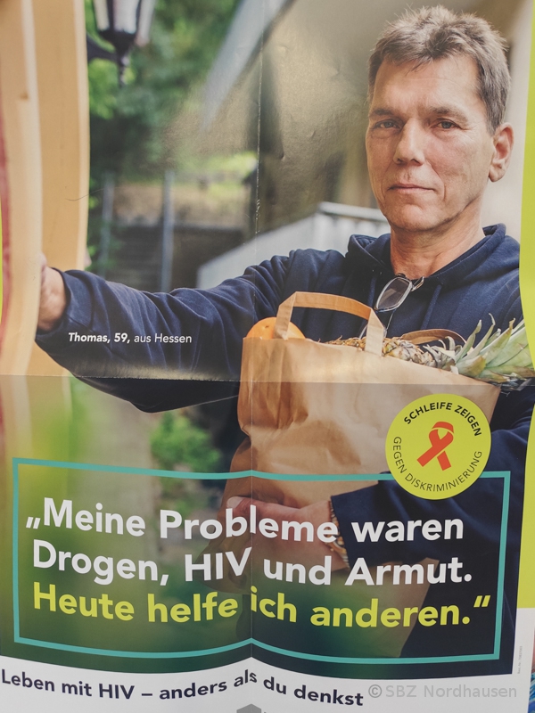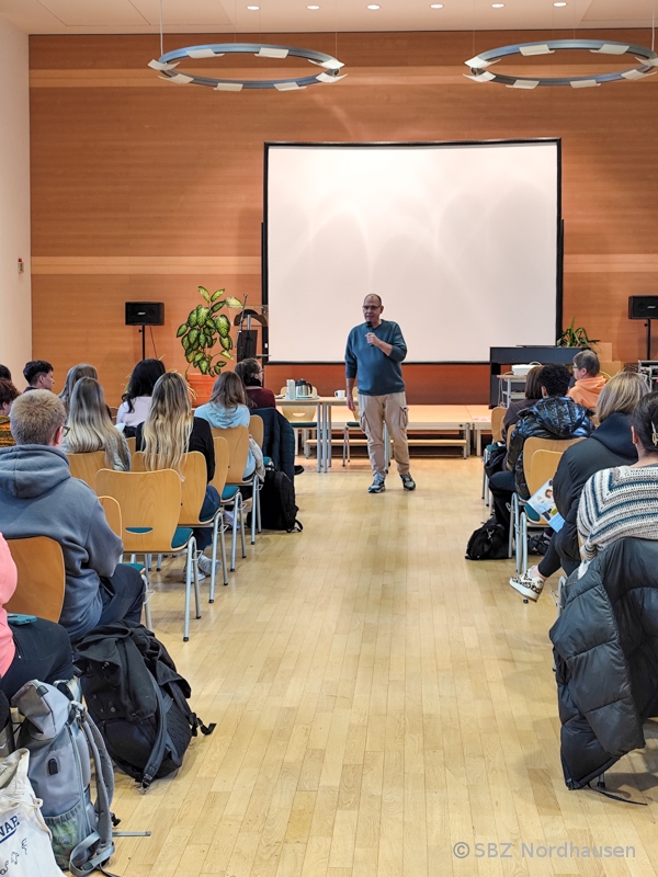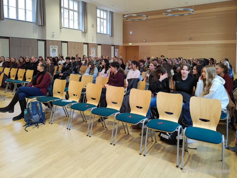 Anlässlich des anstehenden Welt-Aids-Tages am 1. Dezember besuchte Matthias Gerschwitz das SBZ Nordhausen unter der Organisation von Frau Wolff (Gesundheitsamt) sowie Frau Manzke (Gesundheitsbeauftragte SBZ NDH). Matthias Gerschwitz, welcher als einer von ca. 100.000 Menschen in Deutschland, 1994 positiv auf HIV (Human Immunodeficiency Virus) getestet wurde, erzählte mit einem Augenzwinkern dennoch eindrucksvoll seine Geschichte und dabei auch den geschichtlichen Werdegang von HIV und der daraus resultierenden Erkrankung AIDS (acquired immune deficiency syndrome).