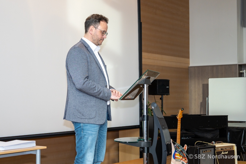 Nach einer einfühlsamen Darbietung von Brian Adams’ „Heaven“ durch die beiden Schüler der Kreismusikschule richtete unser Schulleiter, Herr Drick, das Wort an die Absolventen. In seiner Festrede hob er die erbrachten Leistungen hervor und motivierte die jungen Fachkräfte für ihren weiteren Weg: "In wenigen Minuten halten Sie Ihr Zeugnis in den Händen - ein sichtbares Zeichen für Ausdauer, Können und Engagement. ... Mit Ihrem Abschluss verfügen Sie über ein solides Fundament, um die rasanten Entwicklungen unserer Zeit nicht nur zu begleiten, sondern aktiv mitzugestalten. Ihre beruflichen Perspektiven sind vielfältig - von der klassischen Werkstatt über Spezialisierungen bis hin zu Weiterbildungen und irgendwann auch die Wahrnehmung von Führungsaufgaben. ... Sie haben gelernt, Verantwortung zu übernehmen, selbstständig zu arbeiten und Probleme eigenständig zu lösen. Die gewonnene Selbstständigkeit ist ein entscheidender Schritt in Ihrem beruflichen und persönlichen Leben. ... Nutzen Sie die Chancen, die sich Ihnen bieten, bleiben Sie neugierig und mutig und verlieren Sie nie die Freude an Ihrem Beruf!"