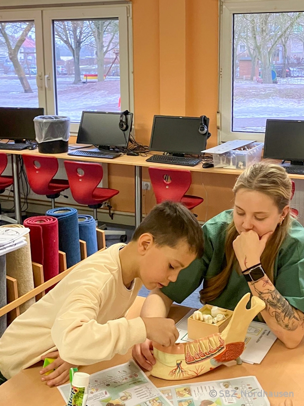 Tatkräftig unterstützt wurde der Projekttag von den Auszubildenden zur Zahnmedizinischen Fachangestellten aus dem dritten Ausbildungsjahr (ZFA23). Sie führten die verschiedenen Stationen durch und vermittelten Themen wie Zahnreinigung, Kariesentstehung und gesunde Ernährung kindgerecht und praxisnah. Für sie war es eine große Freude, gemeinsam mit den Kindern zu arbeiten, ihr Interesse zu wecken und ihr erlerntes Fachwissen direkt in der Praxis anzuwenden. Die Grundschülerinnen und Grundschüler waren sehr motiviert, stellten viele Fragen und machten den Tag auch für die zukünftigen Zahnfeen vom Staatlichen Berufsschulzentrum Nordhausen zu einem spannenden Erlebnis.