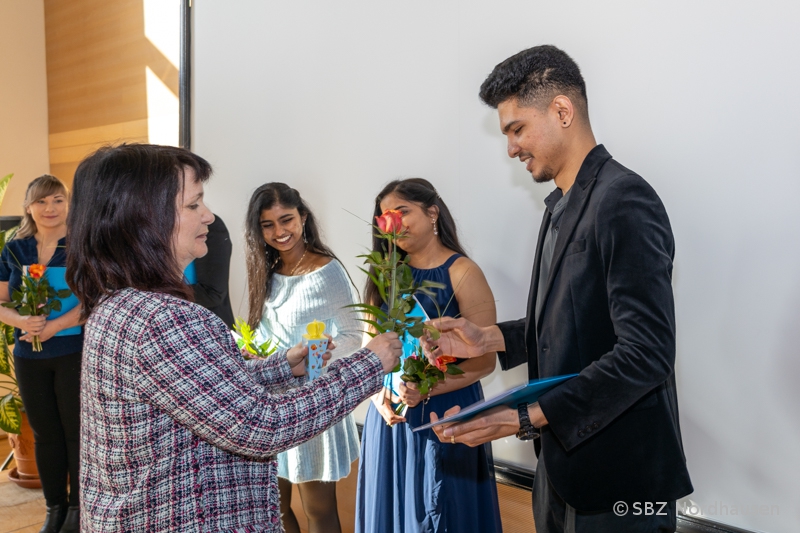 Mit herzlichen Worten resümierte auch die Klassenlehrerin, Frau Anke Heise, die Zeit mit "ihren" Schützlingen. Als sie die Aufgabe erhielt, eine Klasse mit Schülerinnen und Schülern aus Indien zu betreuen, war sie voller Erwartungen und Respekt. Niemand wusste genau, was auf ihn zukommt, doch alle einte das Ziel, die Ausbildung zum Pflegefachmann bzw. zur Pflegefachfrau erfolgreich zu meistern. "Die Jahre waren geprägt vom gemeinsamen Lernen in Theorie und Praxis, großen Anstrengungen, gelegentlichem Zweifel, aber auch besonderen Momenten: Ausflüge, Frühstücksrunden, Projekte, das Schulfest und nicht zuletzt die Abschlussfeier." Bemerkenswert war die Bitte der Klassenlehrerin an die Absolventin Maria Grohmann, ihr zu verzeihen, dass sie sie zu Beginn der Ausbildung zur „Mutti der Klasse“ ernannt hat. Das Engagement der jungen Frau für ihre Mitschülerinnen und Mitschüler hat rückblickend nicht unwesentlich zu deren Erfolg beigetragen. Danke! Frau Heise sagte zum Abschluss: "Sie waren eine sehr angenehme Klasse, hatten immer ein Lächeln auf den Lippen, waren offen, strebsam und bereit, sich allen Herausforderungen zu stellen. Ich möchte mich dafür bedanken, dass ich Sie kennenlernen und mit Ihnen zusammenarbeiten durfte. Meinen allerherzlichsten Glückwunsch zu Ihrem erfolgreichen Abschluss. Ich wünsche Ihnen alles erdenklich Gute auf ihrem weiteren Lebensweg."