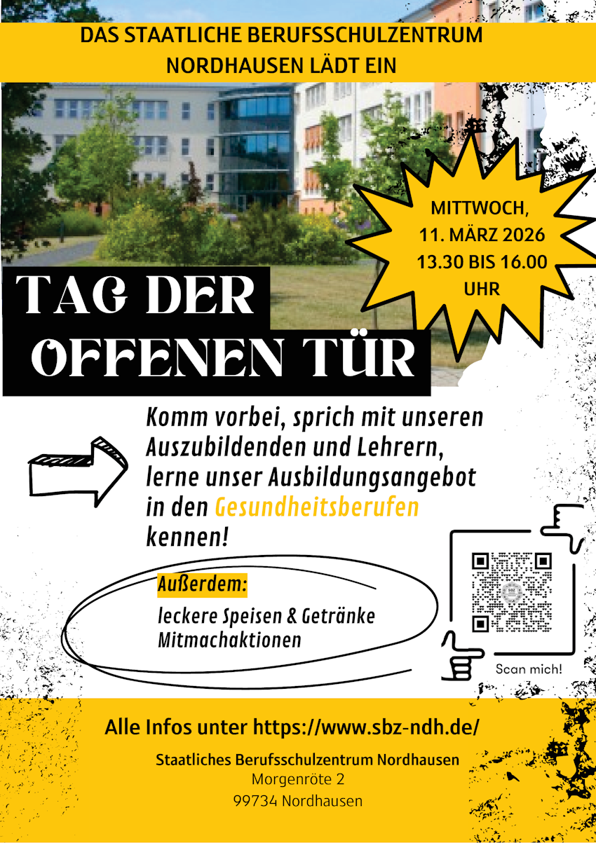 am Staatlichen Berufsschulzentrum Nordhausen. Wir informieren Sie gern über Bildungsmöglichkeiten und Ereignisse in und außerhalb des Unterrichts an unseren beiden Schulteilen (Straße der Genossenschaften und Morgenröte). Alle wichtigen Informationen zu Berufsfeldern und Schulformen sowie den darin möglichen Bildungsgängen und Abschlüssen erreichen Sie über das Hauptmenü oben. Ergänzt durch die Inhalte im Seitenmenü links bieten wir umfangreiche Informationen nicht nur für unsere mehr als 1.100 Auszubildenden, Schülerinnen und Schüler. Für registrierte Nutzerinnen und Nutzer erweitert sich das Angebotsspektrum nach dem Login. Die aktuellsten Beiträge finden Sie stets hier auf der Startseite.