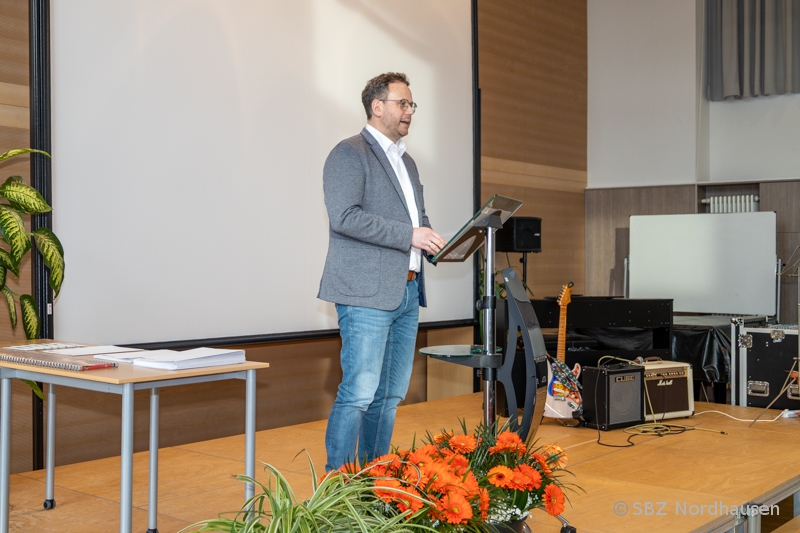 Nach einer einfühlsamen Darbietung von Brian Adams’ „Heaven“ durch die beiden Schüler der Kreismusikschule richtete unser Schulleiter, Herr Drick, das Wort an die Absolventen. In seiner Festrede hob er die erbrachten Leistungen hervor und motivierte die jungen Fachkräfte für ihren weiteren Weg: "In wenigen Minuten halten Sie Ihr Zeugnis in den Händen - ein sichtbares Zeichen für Ausdauer, Können und Engagement. ... Mit Ihrem Abschluss verfügen Sie über ein solides Fundament, um die rasanten Entwicklungen unserer Zeit nicht nur zu begleiten, sondern aktiv mitzugestalten. Ihre beruflichen Perspektiven sind vielfältig - von der klassischen Werkstatt über Spezialisierungen bis hin zu Weiterbildungen und irgendwann auch die Wahrnehmung von Führungsaufgaben. ... Sie haben gelernt, Verantwortung zu übernehmen, selbstständig zu arbeiten und Probleme eigenständig zu lösen. Die gewonnene Selbstständigkeit ist ein entscheidender Schritt in Ihrem beruflichen und persönlichen Leben. ... Nutzen Sie die Chancen, die sich Ihnen bieten, bleiben Sie neugierig und mutig und verlieren Sie nie die Freude an Ihrem Beruf!"