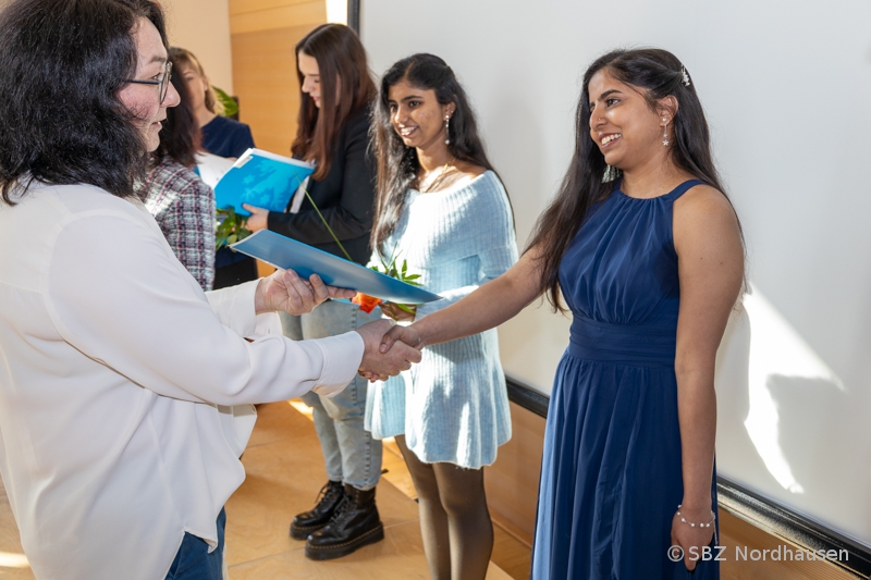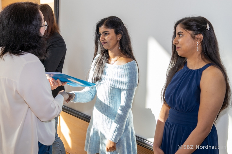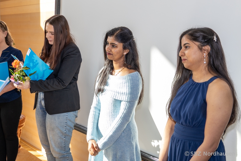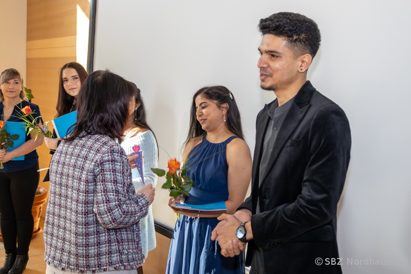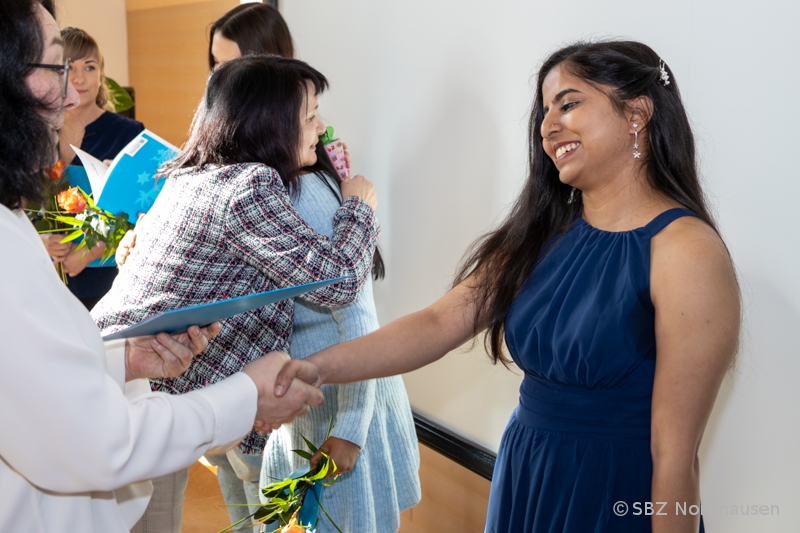 Mit herzlichen Worten resümierte auch die Klassenlehrerin, Frau Anke Heise, die Zeit mit "ihren" Schützlingen. Als sie die Aufgabe erhielt, eine Klasse mit Schülerinnen und Schülern aus Indien zu betreuen, war sie voller Erwartungen und Respekt. Niemand wusste genau, was auf ihn zukommt, doch alle einte das Ziel, die Ausbildung zum Pflegefachmann bzw. zur Pflegefachfrau erfolgreich zu meistern. "Die Jahre waren geprägt vom gemeinsamen Lernen in Theorie und Praxis, großen Anstrengungen, gelegentlichem Zweifel, aber auch besonderen Momenten: Ausflüge, Frühstücksrunden, Projekte, das Schulfest und nicht zuletzt die Abschlussfeier." Bemerkenswert war die Bitte der Klassenlehrerin an die Absolventin Maria Grohmann, ihr zu verzeihen, dass sie sie zu Beginn der Ausbildung zur „Mutti der Klasse“ ernannt hat. Das Engagement der jungen Frau für ihre Mitschülerinnen und Mitschüler hat rückblickend nicht unwesentlich zu deren Erfolg beigetragen. Danke! Frau Heise sagte zum Abschluss: "Sie waren eine sehr angenehme Klasse, hatten immer ein Lächeln auf den Lippen, waren offen, strebsam und bereit, sich allen Herausforderungen zu stellen. Ich möchte mich dafür bedanken, dass ich Sie kennenlernen und mit Ihnen zusammenarbeiten durfte. Meinen allerherzlichsten Glückwunsch zu Ihrem erfolgreichen Abschluss. Ich wünsche Ihnen alles erdenklich Gute auf ihrem weiteren Lebensweg."