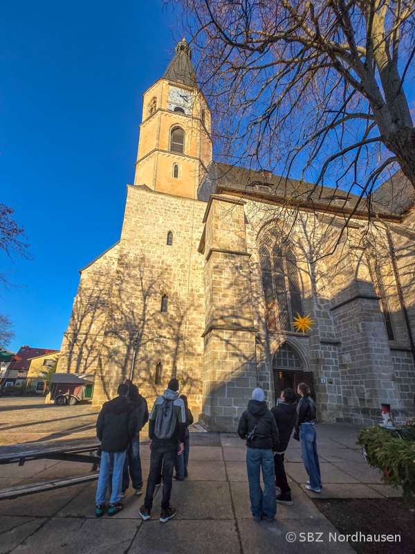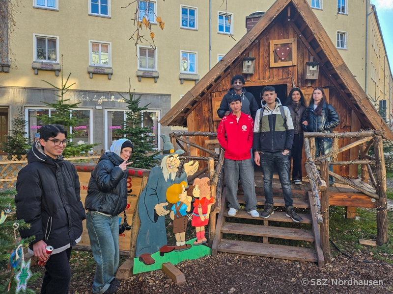 Wir gingen auch am ältesten Haus von Nordhausen und am Splitterschutzgraben vorbei. Zum Abschluss der Stadttour besuchten wir den Weihnachtsmarkt und klärten die restlichen Fragen, welche den Schülerinnen und Schülern in den Sinn gekommen waren.
